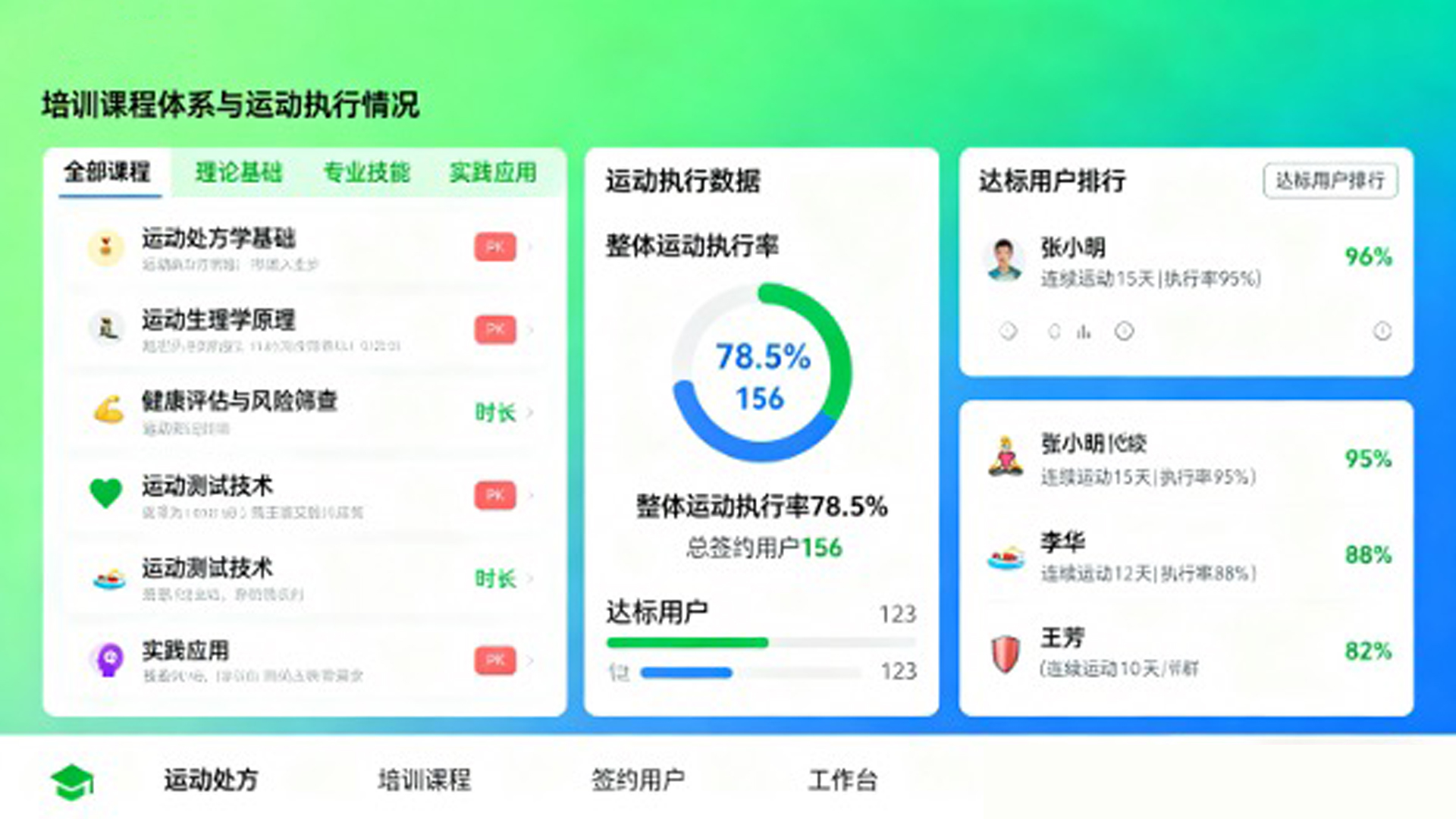 软件支持运动数据智能管理,服务人员可便捷查看用户打卡与运动执行情况;能结合用户数据与慢病状况,多模式定制个体化运动干预方案;还内置运动干预方案技能课程,助力专业人员提升专业度。